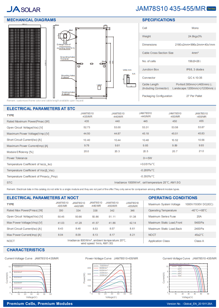 * Thông số kỹ thuật của Tấm pin năng lượng mặt trời Mono JA Solar 445W (JAM78S10 435-455/MR)